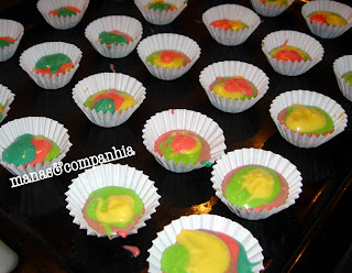 Precisava de levar para uma festinha alguma coisa e lembrei-me de mini-queques que, com uma decoração apropriada, se transformariam em cupcakes! A base é conhecida e o creme decorativo já o tinha congelado de outras aventuras, pelo que foi só ter paciência para encher as forminhas com pequenos pedaços de massa colorida!